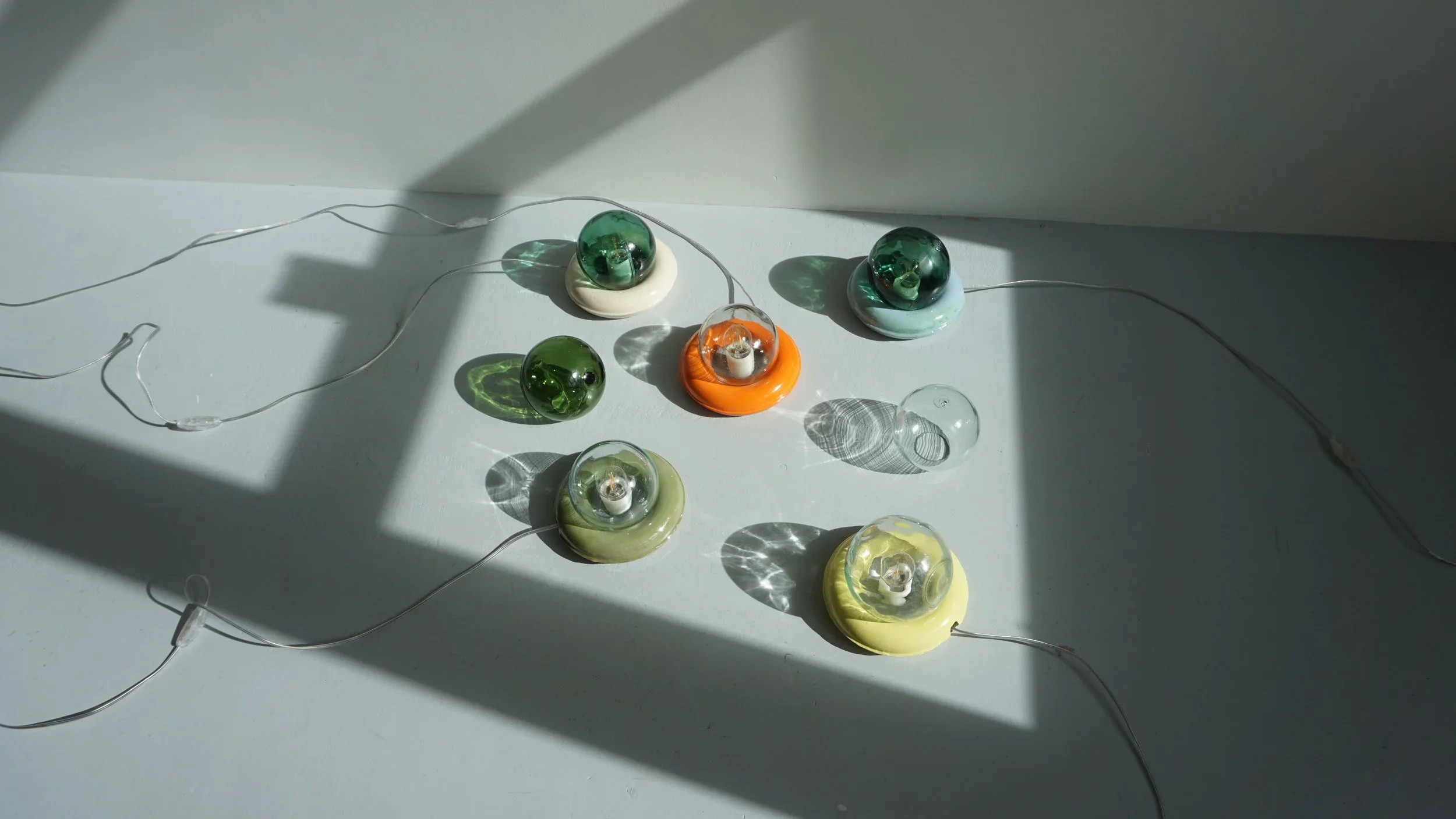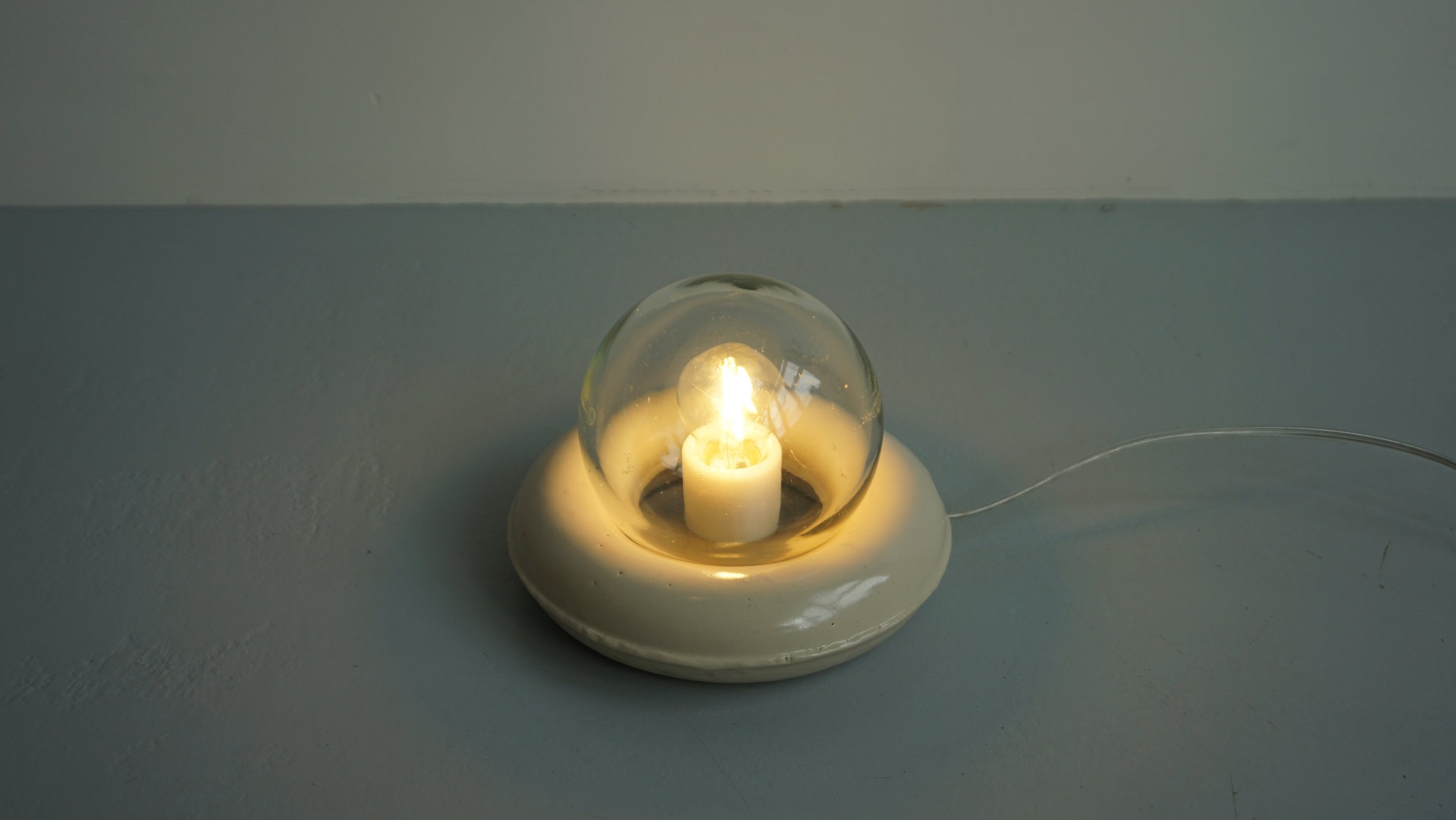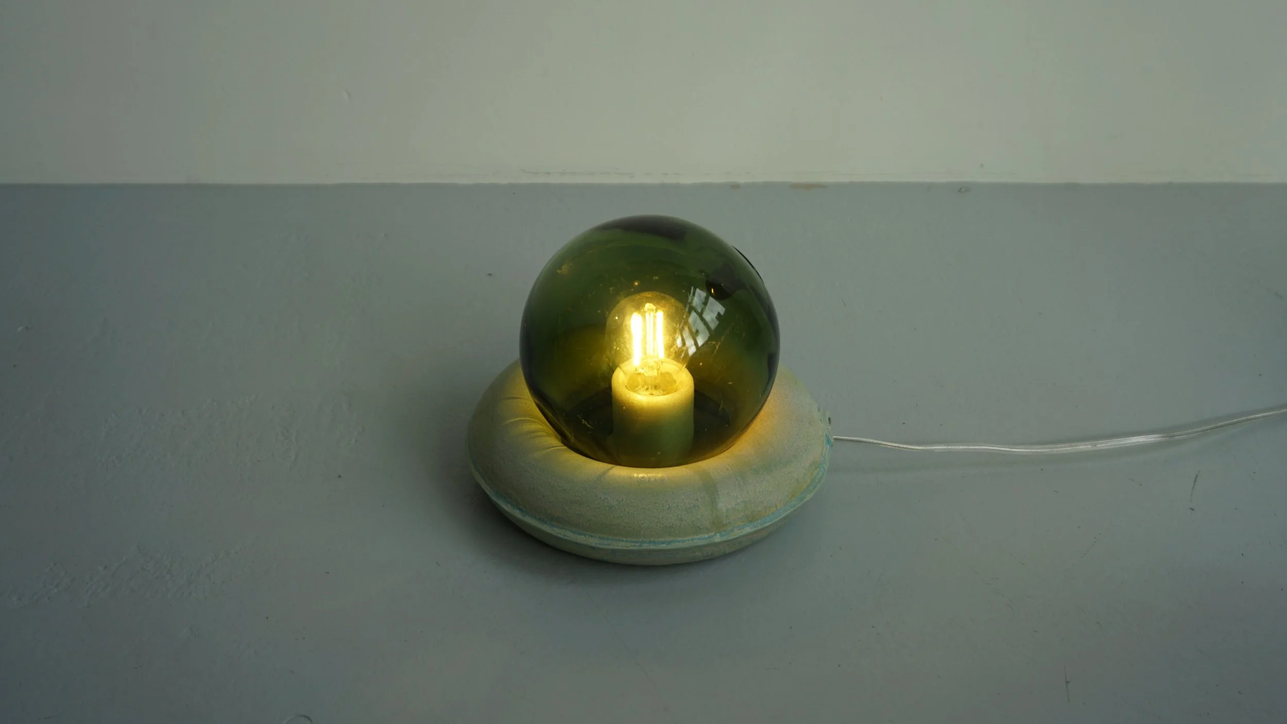 In these lamps, various production marks are embraced, whether it’s seams or text that hint at both how and where the original objects were made. Material: Glazed ceramics, 3D printed TPU and a glass float.