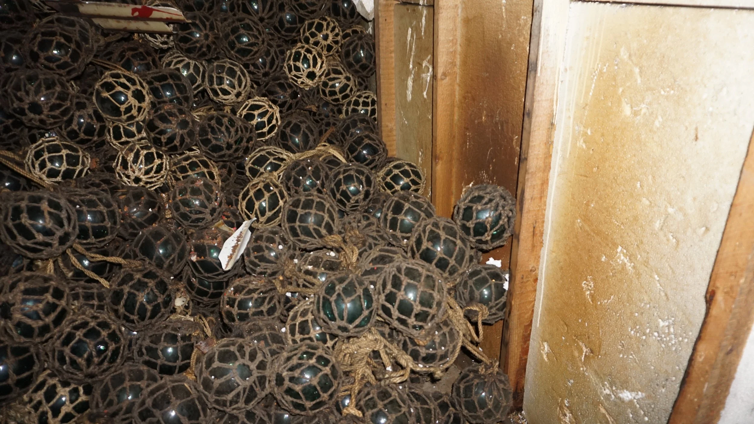 The glass float and the net ring once served the same purpose: keeping fishing nets afloat. Now, these objects take on a new role in the form of a lamp, where the ring holds the glass buoy afloat.